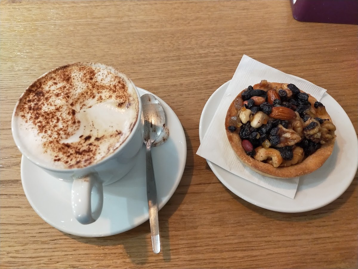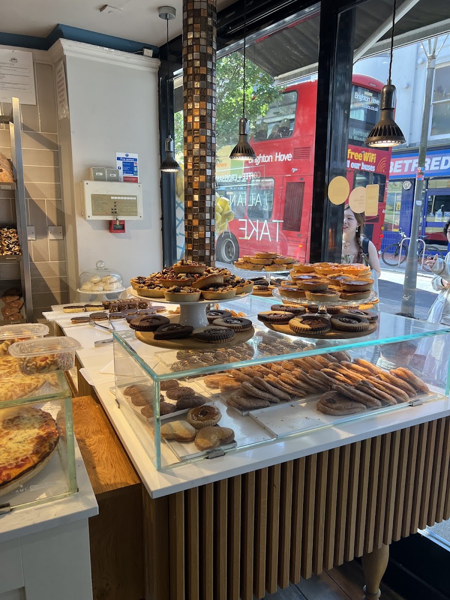 This place located centrally in brighton on Saint James street offers a variety of bakes from sweet to savoury. I did not want to give it a 4 star first but the food saved it. I had a chocolate cake which seemed made with coconut and cocoa topped with shredded coconut pieces. It tastes great and fudgy( 3£) The decaf latte was a large one for 3.3£, with a delightful taste of fresh coffee. The pizza is mind blowing, I love thick crust pizzas.but this one has a fluffy spongy thick crust, that is crispy on the bottom and melts in your mouth i got the vegetarian one which had mixed vegs and topped with probably the best cheese. In few words the pizza had an amazing taste that lifted me. A slice of pizza is for 2.95£. On the other hand, the place doesn't offer a menu with price list, and no prices are displayed on the items. One of the staff was very dry and looked bored which at first gave me a very bad impression of the place. But then I realised it is probably her character cz she tried to pull a smile while serving the coffee. The chefs are so nice and welcoming. I think this place should display item names and prices for people to be encouraged to buy because noone wants to order and be surprised by the bill or be annoying and ask about every single item price especially if staff looked bored and not interested to help. If it wasn't for this it definitely deserves 5 stars The ambiance had chill yet energizing vibe with mix of rnb pop and soul music playing the the background. Seating is okey but can be improved, you could also see the bakery kitchen which is reassuring.toilettes are clean and neat.